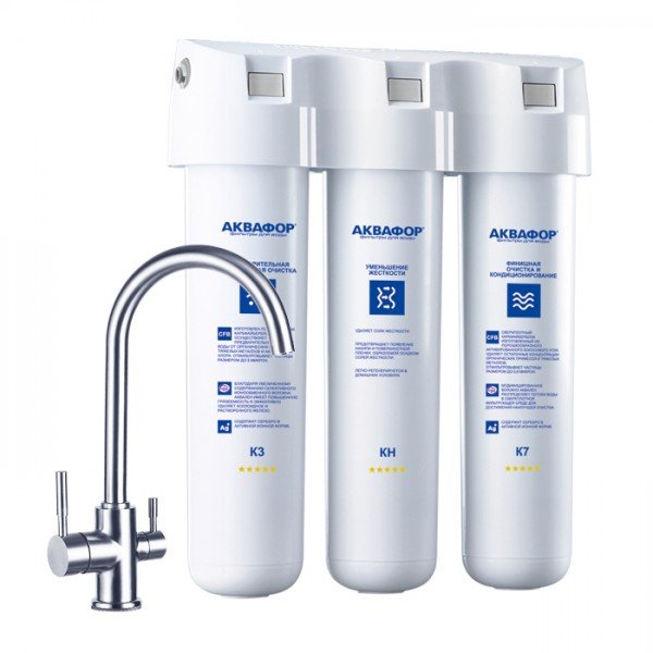 Обратноосмотические фильтры используются для абсолютной защиты от накипи, т.к. полностью устраняют соли жесткости из воды.нетЧисло ступеней очисткиКартриджи последовательно очищают воду и от видимых примесей, и от растворенных. Первый картридж задерживает более крупные частицы, а каждый последующий - более мелкие. Чем больше ступеней - тем лучше фильтр очистит воду: поймает более мелкие видимые частицы ржавчины, песка и ила, успеет захватить из воды максимум растворенных примесей - хлора, нитратов, тяжелых металлов и других.3МинерализацияПроисходит после финишной очистки воды. Необходима прежде всего в фильтре обратного осмоса, поскольку такой фильтр полностью устраняет из воды все примеси, в том числе минералы. Минералы добавляются в оптимальной концентрации - для пользы и привычного вкуса воды.нетПостфильтрацияФинальный этап очистки воды: картриджи постфильтрации удаляют самые мелкие механические частицы и кондиционируют воду, придавая ей более приятный вкус.нетНакопительная емкостьОбычно нужна в фильтрах обратного осмоса. Глубокая фильтрация требует времени. Чтобы Вам не приходилось ждать, пока вода наберется в чайник или кастрюлю, почти во всех моделях используется накопительный бак для чистой воды или другая емкость. В стандартном фильтре обратного осмоса под мойку воды в баке достаточно для семьи из 5-6 человек.нетФильтрующий модуль в комплектедаОтдельный краннетДавление в водопроводе не более, атмМаксимальное давление воды на входе в систему, при котором возможна стабильная работа фильтра.6,5Ширина, смОбратите внимание на габариты фильтра, и измерьте, сколько свободного пространства в предполагаемом месте установки.26,0Глубина, смОбратите внимание на габариты фильтра, и измерьте, сколько свободного пространства в предполагаемом месте установки.9,0Защита корпуса от гидроударовдаИсходная водаЖесткая вода – вода с избытком минеральных солей. От нее появляется накипь в чайнике, известковый налет на сантехнике и разводы на посуде. Мягкая вода – та, в которой мало минеральных солей. Нет накипи в чайнике и разводов на посуде. Фильтры для мутной воды и фильтры от ржавчины, как правило, имеют несколько стадий очистки и дополнительный полипропиленовый картридж. Он задерживает механические частицы ила, песка и ржавчины и защищает картриджи более глубокой очистки.жёсткаяУстраняет мутностьМутность водопроводной воды может говорить о том, что в ней много мелких механических частиц. Важно, чтобы в фильтре был установлен дополнительные картридж механической предфильтрации (полипропиленовый) - он продлит жизнь остальным картриджам более тонкой очистки.нетУстраняет ржавчину, бурый осадокЛюбой фильтр под мойку удалит из воды крупные и мелкие частицы ржавчины. Некоторые фильтры имеют повышенный ресурс по железу: они дольше служат в такой воде, поскольку лучше подходят для удаления из воды железа и механических частиц ржавчины.нетЗащита от бактерийВсе проточные фильтры в той или иной степени защищают от бактерий. Например, добавление серебра препятствует их размножению. Это стандартная степень защиты. Если в семье есть дети, пожилые люди или аллергики, воду рекомендуется обеззараживать, то есть полностью удалять микроорганизмы. Повышенную защиту от бактерий дают фильтры с половолоконной мембраной. Это пучок т