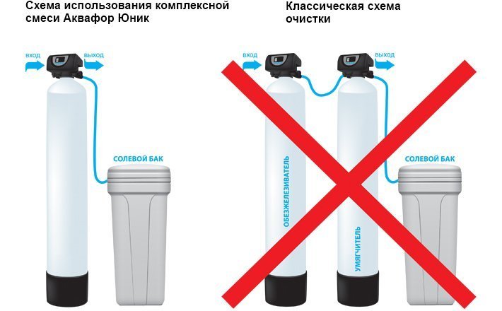 Аквафор Юник — смесь специально подобранных ионообменных и инертных материалов, скомпонованных в определенных соотношениях в единую фильтрующую среду. Инертный слой, задерживающий крупные примеси в верхнем слое, предотвращает вымывание мелкозернистых фракций фильтрующей смеси в дренаж во время регенерации и обратной промывки фильтра, защищает управляющий клапан от попадания в него частиц смеси, что гарантированно продлевает срок эксплуатации системы. Основным активным компонентом смеси является катион-анионообменный комплекс, в котором объединены различные по составу и функциональному назначению смолы. В результате такого объединения увеличивается плотность фильтрующего материала, площадь контакта среды с водой и эффективность работы смеси.