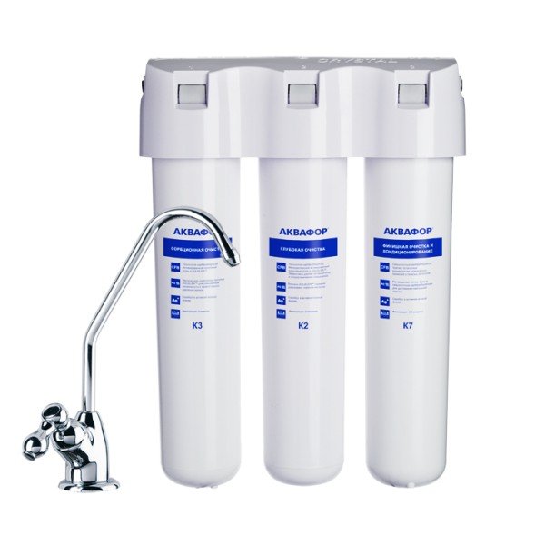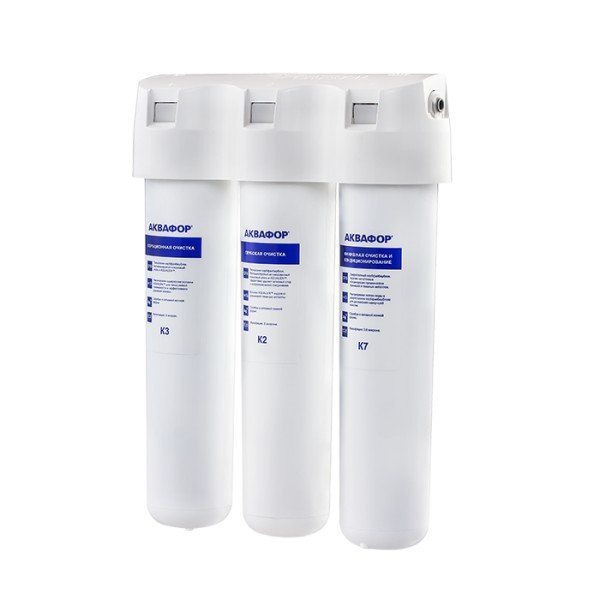 Обратноосмотические фильтры используются для абсолютной защиты от накипи, т.к. полностью устраняют соли жесткости из воды.нетЧисло ступеней очисткиКартриджи последовательно очищают воду и от видимых примесей, и от растворенных. Первый картридж задерживает более крупные частицы, а каждый последующий - более мелкие. Чем больше ступеней - тем лучше фильтр очистит воду: поймает более мелкие видимые частицы ржавчины, песка и ила, успеет захватить из воды максимум растворенных примесей - хлора, нитратов, тяжелых металлов и других.3МинерализацияПроисходит после финишной очистки воды. Необходима прежде всего в фильтре обратного осмоса, поскольку такой фильтр полностью устраняет из воды все примеси, в том числе минералы. Минералы добавляются в оптимальной концентрации - для пользы и привычного вкуса воды.нетПостфильтрацияФинальный этап очистки воды: картриджи постфильтрации удаляют самые мелкие механические частицы и кондиционируют воду, придавая ей более приятный вкус.нетНакопительная емкостьОбычно нужна в фильтрах обратного осмоса. Глубокая фильтрация требует времени. Чтобы Вам не приходилось ждать, пока вода наберется в чайник или кастрюлю, почти во всех моделях используется накопительный бак для чистой воды или другая емкость. В стандартном фильтре обратного осмоса под мойку воды в баке достаточно для семьи из 5-6 человек.нетФильтрующий модуль в комплектедаОтдельный крандаДавление в водопроводе не более, атмМаксимальное давление воды на входе в систему, при котором возможна стабильная работа фильтра.6,5Ширина, смОбратите внимание на габариты фильтра, и измерьте, сколько свободного пространства в предполагаемом месте установки.26,0Глубина, смОбратите внимание на габариты фильтра, и измерьте, сколько свободного пространства в предполагаемом месте установки.9,0Защита корпуса от гидроударовдаИсходная водаЖесткая вода – вода с избытком минеральных солей. От нее появляется накипь в чайнике, известковый налет на сантехнике и разводы на посуде. Мягкая вода – та, в которой мало минеральных солей. Нет накипи в чайнике и разводов на посуде. Фильтры для мутной воды и фильтры от ржавчины, как правило, имеют несколько стадий очистки и дополнительный полипропиленовый картридж. Он задерживает механические частицы ила, песка и ржавчины и защищает картриджи более глубокой очистки.мягкаяУстраняет мутностьМутность водопроводной воды может говорить о том, что в ней много мелких механических частиц. Важно, чтобы в фильтре был установлен дополнительные картридж механической предфильтрации (полипропиленовый) - он продлит жизнь остальным картриджам более тонкой очистки.нетУстраняет ржавчину, бурый осадокЛюбой фильтр под мойку удалит из воды крупные и мелкие частицы ржавчины. Некоторые фильтры имеют повышенный ресурс по железу: они дольше служат в такой воде, поскольку лучше подходят для удаления из воды железа и механических частиц ржавчины.нетЗащита от бактерийВсе проточные фильтры в той или иной степени защищают от бактерий. Например, добавление серебра препятствует их размножению. Это стандартная степень защиты. Если в семье есть дети, пожилые люди или аллергики, воду рекомендуется обеззараживать, то есть полностью удалять микроорганизмы. Повышенную защиту от бактерий дают фильтры с половолоконной мембраной. Это пучок тру