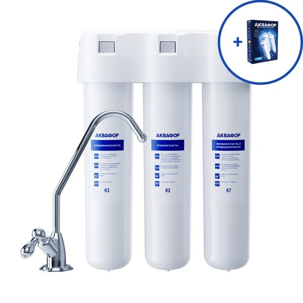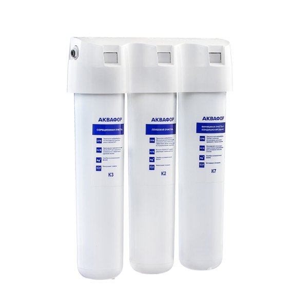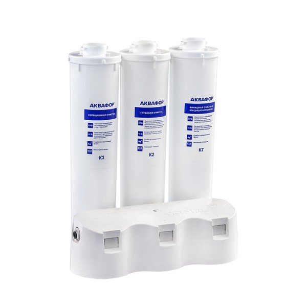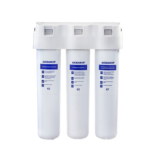 Три картриджа последовательно очищают воду от видимых механических примесей и растворенных вредных веществ. Блок предварительной очистки К3 задерживает частицы размером от 5 микрон, модуль глубокой очистки К2 – от 3 микрон. Третий модуль К7 обеспечивает финишную очистку от частиц до 0,8 микрон (что в 125 раз тоньше человеческого волоса). Карбонблок с Акваленом захватывает и надежно задерживает тяжелые металлы и другие опасные примеси, которые чаще всего встречаются в водопроводной воде.